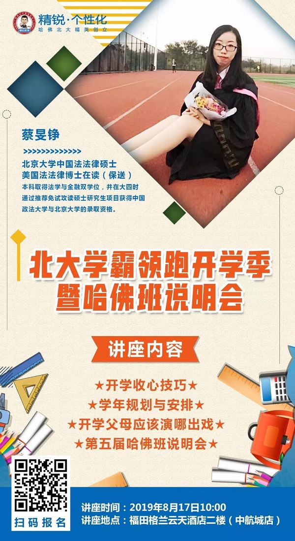 為了幫助深圳的孩子擺脫假期綜合征,快速適應新年級帶來的變化,《北大學霸領跑開學季》公益講座特別邀請到北大學霸蔡旻錚學姐于本周六和深圳的家長、學生分享開學收心技巧,如何做好學年規(guī)劃與安排。