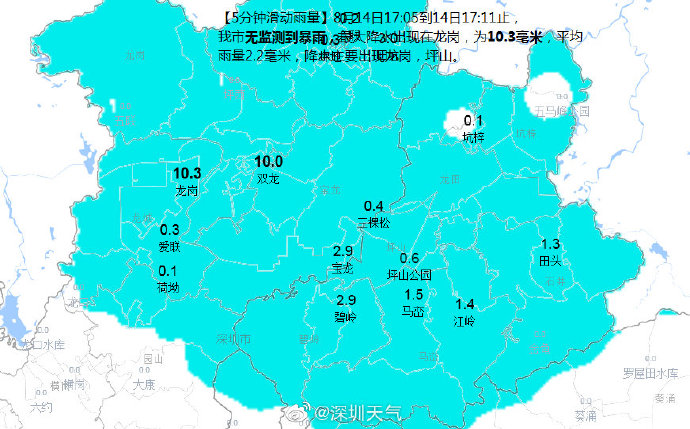 預(yù)計坪山區(qū)和龍崗區(qū)(坪地、寶龍、龍崗、龍城街道)1小時內(nèi)將出現(xiàn)30毫米左右降水,深圳市氣象臺于2019年08月14日17時05分在坪山區(qū)和龍崗區(qū)(坪地、寶龍、龍崗、龍城街道)發(fā)布暴雨黃色分區(qū)預(yù)警,全市進(jìn)入暴雨戒備狀態(tài),請注意防范。