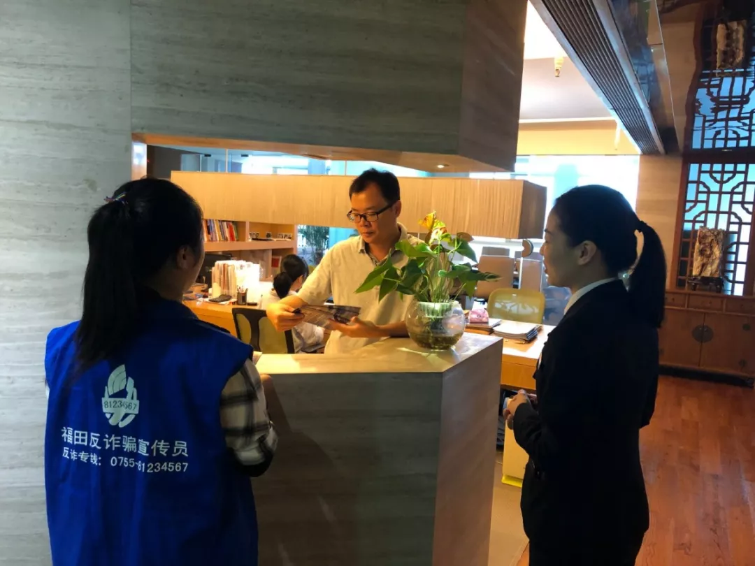 上午10時(shí),深圳市公安局福田分局派出“藍(lán)馬甲”宣傳隊(duì)走入大中華國際交易廣場,逐層逐戶向企業(yè)員工們派發(fā)反詐騙宣傳單及《福田反詐騙教育??贰!八{(lán)馬甲”宣傳隊(duì)員走進(jìn)各企業(yè)辦公室,向企業(yè)員工派發(fā)相關(guān)資料,講解反詐騙知識。各企業(yè)員工積極參與,與“藍(lán)馬甲”講師頻頻互動(dòng),并認(rèn)真學(xué)習(xí)反詐騙技巧,努力提升自身反詐騙能力。
