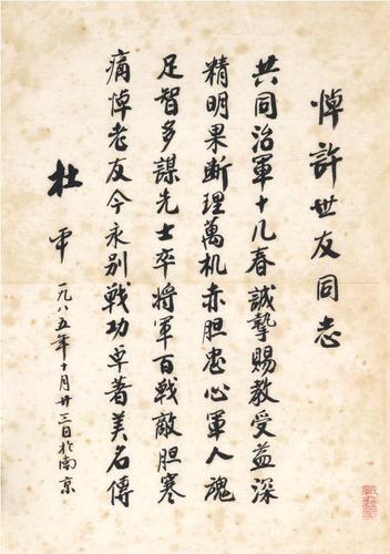 在采訪一位又一位身經百戰(zhàn)的幸存者時,吳東峰與他們的筆墨緣也就此結下。“1985年許世友將軍因病逝世,杜平將軍親手書寫‘悼許世友同志’詩一首,請我送《人民日報》刊登,我把詩傳真過去,原件保存下來了。這首詩見證了杜平與許世友的深厚友情,是我最早的將軍墨跡手藏。那之后,我開始有意識地收集將軍們的筆墨。”