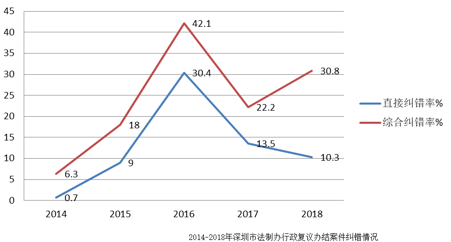 2018年深圳行政復(fù)議案件數(shù)量大幅減少,這可能與“兩隨機(jī)一公開(kāi)”執(zhí)法全面推廣后執(zhí)法規(guī)范性進(jìn)一步提高和執(zhí)法爭(zhēng)議減少有關(guān)。辦結(jié)的行政復(fù)議案件中,被撤銷或確認(rèn)違法的案件比例繼續(xù)降低,但裁定終止的案件總件數(shù)雖略少于上年,比例卻有一定幅度上升??傮w而言,行政復(fù)議的直接糾錯(cuò)率有所下降,但間接糾錯(cuò)率有所上升,較好發(fā)揮了行政復(fù)議對(duì)行政執(zhí)法的監(jiān)督作用。