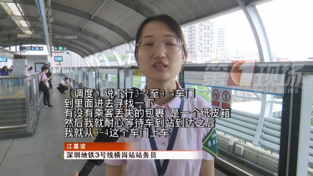 當(dāng)時,一輛列車即將到達龍崗的橫崗站,站務(wù)員從3-4號門上車尋找。最終,站務(wù)員在列車座位下面找到了乘客遺失的紙箱,并通知乘客前往橫崗站。