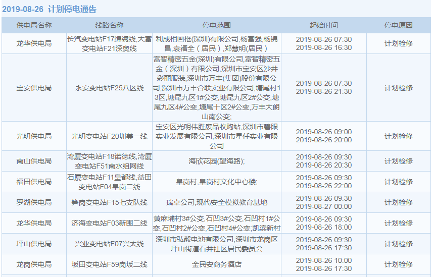 8月26日計(jì)劃停電通知: