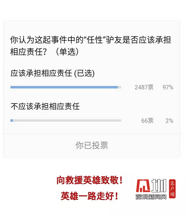 有一個(gè)細(xì)節(jié)是,這批受困的驢友上山溯溪的時(shí)間正是深圳發(fā)布臺(tái)風(fēng)預(yù)警信號(hào)的時(shí)間,因此很多人也認(rèn)為在臺(tái)風(fēng)天探險(xiǎn),驢友過(guò)于任性。在深圳新聞網(wǎng)微信公眾號(hào)發(fā)起的小調(diào)查(你認(rèn)為這起事件中的“任性”驢友是否應(yīng)該承擔(dān)相應(yīng)責(zé)任?(單選))中,共有2553名網(wǎng)友作答,97%的人認(rèn)為應(yīng)該承擔(dān)相應(yīng)責(zé)任。