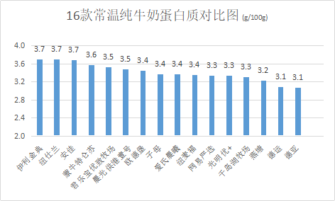 16款常溫純牛奶蛋白質(zhì)含量均符合我國國標(biāo)要求,但蛋白質(zhì)含量表現(xiàn)差異大,伊利金典、紐仕蘭、安佳、蒙牛特侖蘇蛋白質(zhì)含量較高,德運、德亞蛋白質(zhì)含量相對較低,接近國標(biāo)最低限值要求。