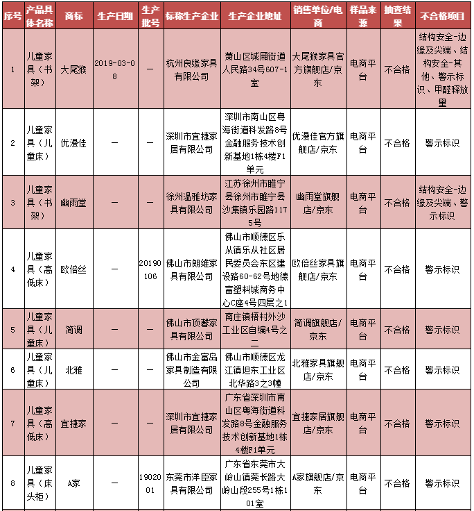 兒童家具產(chǎn)品質(zhì)量監(jiān)督抽查不合格企業(yè)名單