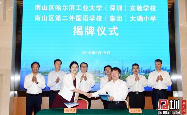 活動(dòng)中,南山區(qū)哈爾濱工業(yè)大學(xué)(深圳)實(shí)驗(yàn)學(xué)校及南山區(qū)第二外國(guó)語(yǔ)學(xué)校(集團(tuán))大磡小學(xué)兩所學(xué)校正式揭牌。南山區(qū)委書(shū)記王強(qiáng),哈工大(深圳)黨委書(shū)記吳德林,南山區(qū)委副書(shū)記、代區(qū)長(zhǎng)黃湘岳,深圳大學(xué)城管理辦公室副主任戴興毅、哈工大(深圳)副校長(zhǎng)姚英學(xué)、南山區(qū)副區(qū)長(zhǎng)練聰、哈工大(深圳)工會(huì)負(fù)責(zé)人張敏等出席簽約儀式,并為兩所新校揭牌。南山區(qū)政協(xié)副主席、區(qū)教育局局長(zhǎng)劉根平主持儀式。