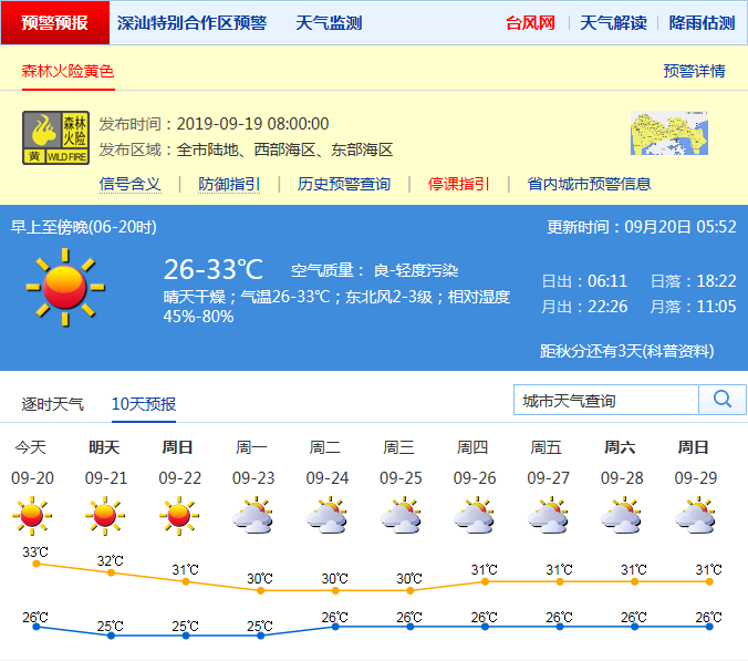 見圳客戶端·深圳新聞網(wǎng)2019年9月20日訊 深圳市氣象局預(yù)計(jì)氣溫26-33℃;東北風(fēng)2-3級;相對濕度50%-80%。 21-22日持續(xù)晴天干燥;23-26日以多云為主。