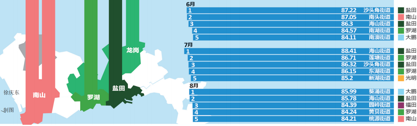 推進環(huán)境質(zhì)量邁進國際一流,深圳一直在行動。細心的市民可能早已發(fā)現(xiàn),深圳市城市管理和綜合執(zhí)法局官方網(wǎng)站每個月都會發(fā)布“深圳市環(huán)境衛(wèi)生指數(shù)排行榜”,為深圳的環(huán)境衛(wèi)生“打分”。據(jù)了解,深圳市環(huán)境衛(wèi)生指數(shù)測評排名已連續(xù)開展了兩年半,有效促進了全市環(huán)境衛(wèi)生的提升和轉(zhuǎn)變。今年上半年的“成績單”顯示,全市各區(qū)(新區(qū))各街道你追我趕,測評工作帶動社區(qū)環(huán)境改善,環(huán)境衛(wèi)生的整治提升得到了市民的廣泛認(rèn)可和好評。