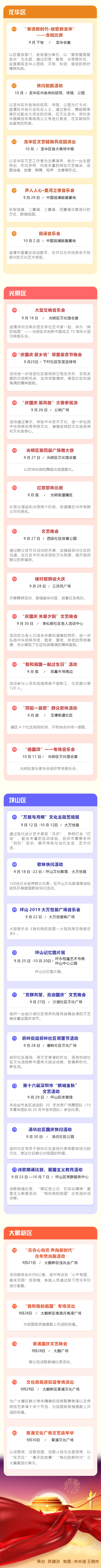 為慶祝中華人民共和國(guó)成立70周年,深圳市將舉辦專場(chǎng)音樂(lè)會(huì)、群眾文藝晚會(huì)、焰火晚會(huì)等活動(dòng),同時(shí)將舉行10場(chǎng)“愛(ài)我中華——南粵百園慶國(guó)慶”主題游園及80場(chǎng)“我和我的祖國(guó)”國(guó)慶群眾文藝嘉年華活動(dòng)。主題游園和文藝嘉年華活動(dòng)安排如下: