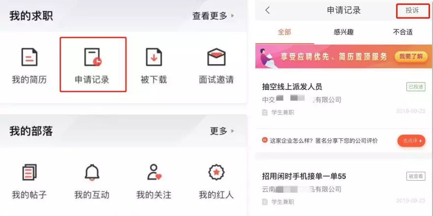 網站設定的投訴規(guī)則是:從自己申請過的求職記錄里選取投訴對象。