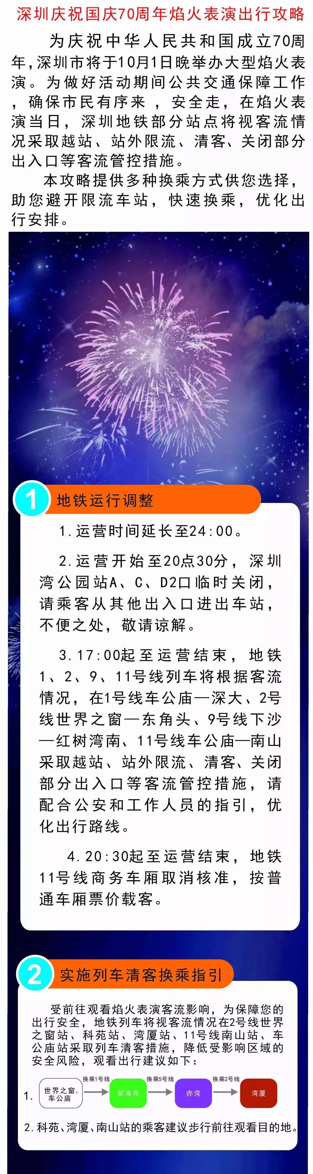 2號線世界之窗、科苑、灣廈站,11號線南山站、車公廟站將視客流情況采取列車清客。
