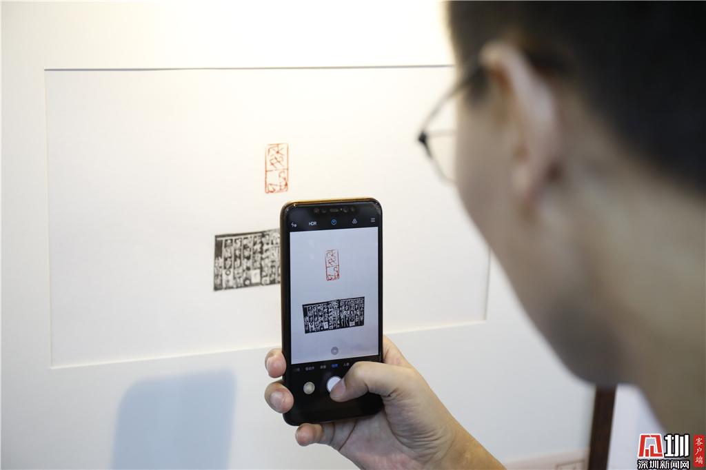 一位參觀者正在欣賞篆刻作品。