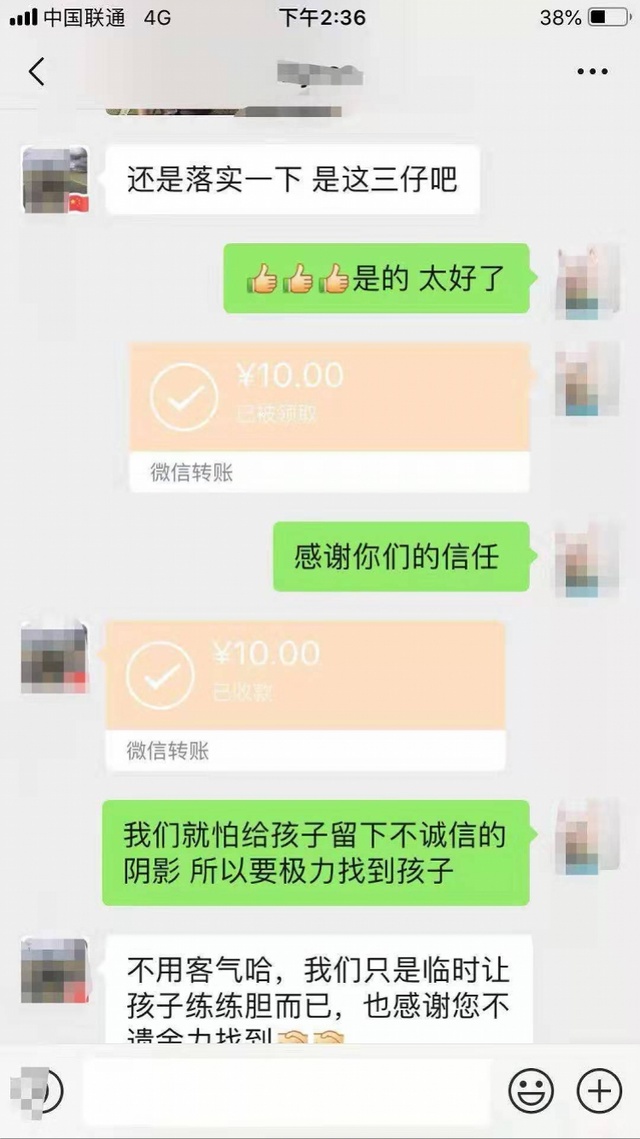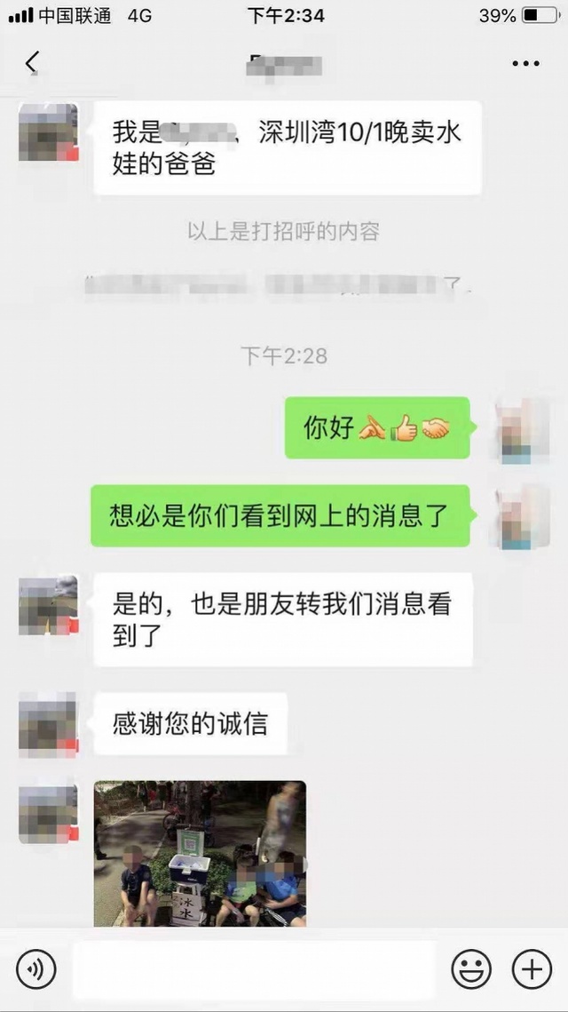 4日,剛從深圳返回青島的張先生告訴記者,中午2時35分,他的微信出現(xiàn)一個新增好友,對方說自己是深圳灣10月1日晚賣水男孩的爸爸,張先生立刻把對方加為好友。賣水男孩爸爸通過微信給張先生發(fā)來一張照片,是國慶當晚孩子在路邊賣水時拍的,讓張先生確認一下是不是照片上的孩子?!笆撬麄?,太好了,終于找到了?!睆埾壬S即通過微信轉賬10元錢過去,賣水男孩爸爸也收款成功。(此前報道:緊急尋人!深圳灣畔的賣水孩子,青島大叔在找你…)