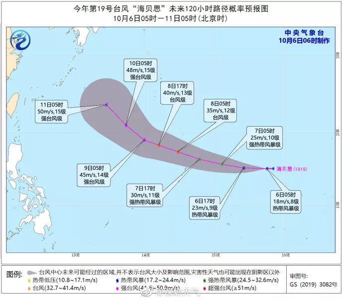 今年第19號臺風(fēng)“海貝思”(熱帶風(fēng)暴級)(英文名稱:Hagibis;名字來源:菲律賓;名字意義:褐雨燕)于今天凌晨2點鐘在西北太平洋洋面上生成,早晨8點鐘其中心位于美國關(guān)島偏東方約1180公里的西北太平洋洋面上。根據(jù)目前的預(yù)報,它會早早拐彎北上,和我們一點關(guān)系都沒有。