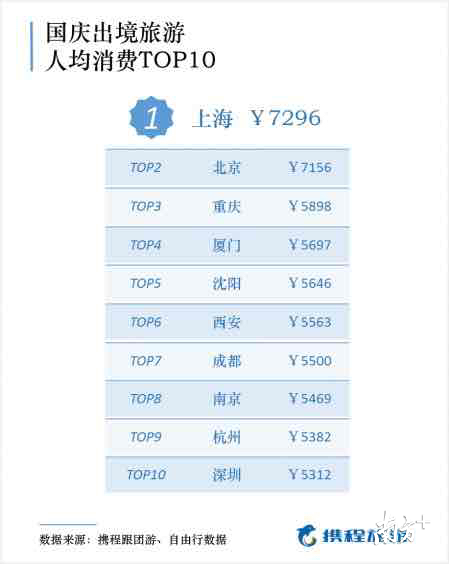 而國(guó)慶假期國(guó)人出境游花費(fèi)多少錢(qián)?據(jù)攜程出境游數(shù)據(jù)顯示,國(guó)慶通過(guò)攜程旅游平臺(tái)報(bào)名跟團(tuán)游、自由行、定制游等度假產(chǎn)品的人均花費(fèi)是國(guó)內(nèi)游價(jià)格的近2倍。出境游消費(fèi)力前十名出發(fā)城市為上海、北京、重慶、廈門(mén)、沈陽(yáng)、西安、成都、南京、杭州和深圳。上海和北京出境游人均花費(fèi)超過(guò)了7000元,遠(yuǎn)遠(yuǎn)超過(guò)了其他城市。