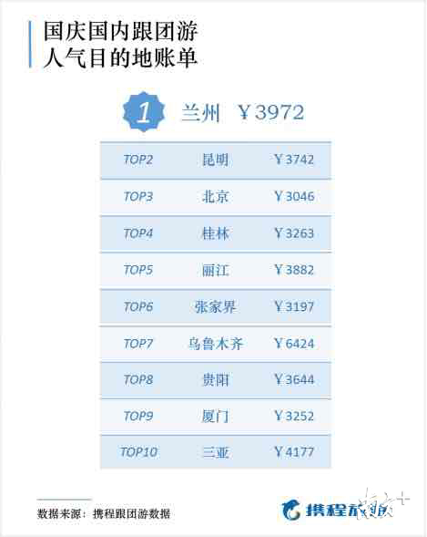 哪些國(guó)內(nèi)旅游城市是今年國(guó)慶的贏家?根據(jù)攜程跟團(tuán)游,最受游客歡迎的國(guó)內(nèi)旅游城市前十分別是蘭州、昆明、北京、桂林、麗江、張家界、烏魯木齊、貴陽(yáng)、廈門(mén)和三亞。其中前往蘭州人均花費(fèi)近4000元。