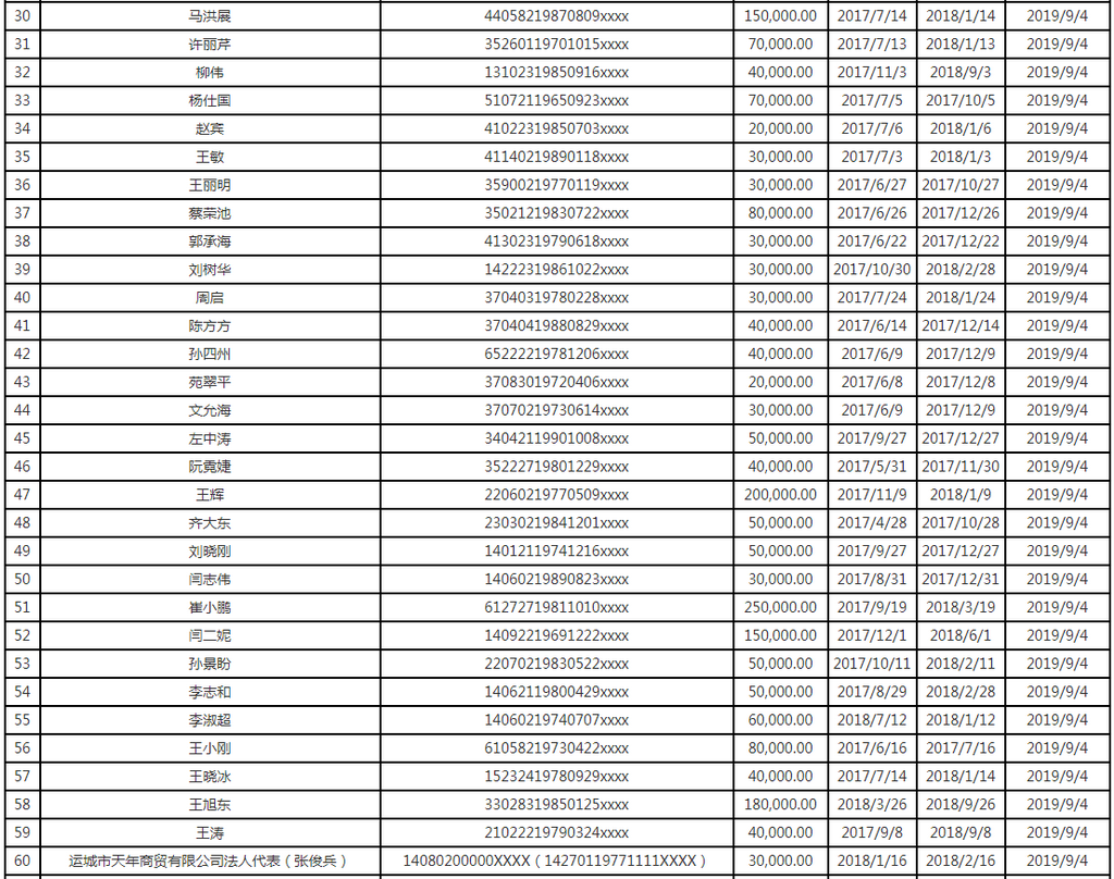 據(jù)深圳市地方金融監(jiān)督管理局披露的網(wǎng)絡(luò)借貸信息中介機(jī)構(gòu)失信人信息表顯示,74名失信網(wǎng)貸借款人中,有5名是企業(yè)的法人代表,分別為運(yùn)城市天年商貿(mào)有限公司法人代表張俊兵、益陽市逸晨貿(mào)易有限公司法人代表熊迎春、南寧市亮輝二手車交易有限責(zé)任公司法人代表肖傳富、清徐縣樂村淘電子商務(wù)有限公司法人代表羅棟及運(yùn)城市韓大汽車銷售服務(wù)有限公司法人代表韓立哲。其中,運(yùn)城市韓大汽車銷售服務(wù)有限公司法人代表韓立哲逾期金額居首,達(dá)到了100萬元,借款時(shí)間是2018年4月2日,逾期開始時(shí)間是2018年10月2日,截至2019年10月9日已逾期一年多。