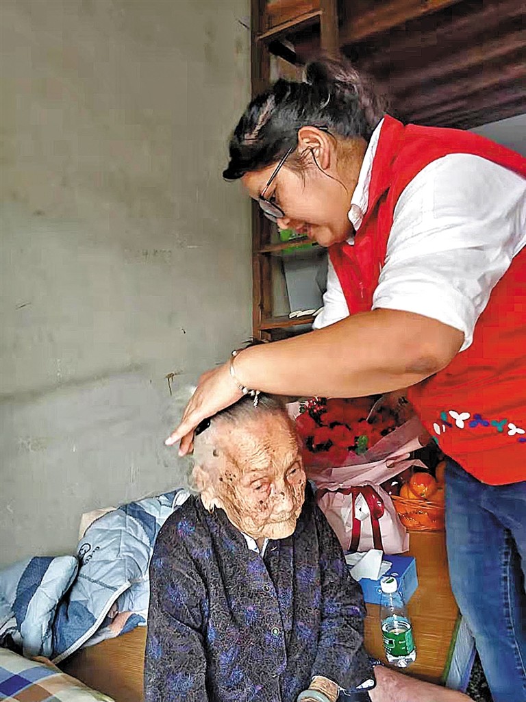 采訪當(dāng)天,老人看到來了這么多人,以為又是政府工作人員來慰問她了,好奇地問外孫女:“今天是過節(jié)嗎?”原來,逢年過節(jié)陳汝金都會收到慰問和祝福,社區(qū)工作人員和社康醫(yī)生也會經(jīng)常上門和她聊聊家常,了解老人家的身體狀況,因此老人對黨和政府送慰問送祝福一點都不陌生。去年,陳汝金老人剛滿百歲,鳳凰社區(qū)黨委還專門組織大家來到老人家中,為老人慶祝百歲生日,并送來大家的祝福和問候。