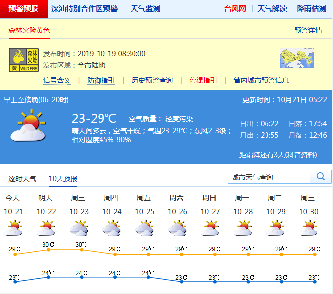 見圳客戶端·深圳新聞網2019年10月21日訊 深圳未來一周天氣較為穩(wěn)定,天氣持續(xù)干燥,預計21日晴天間多云,早晚能見度較差,有輕霧;氣溫23-29℃;東風2-3級;相對濕度45%-90%。22日晴天間多云,早晚有輕霧;23-24日多云,偶有零星小雨,早晚有輕霧;25-27日晴天干燥。