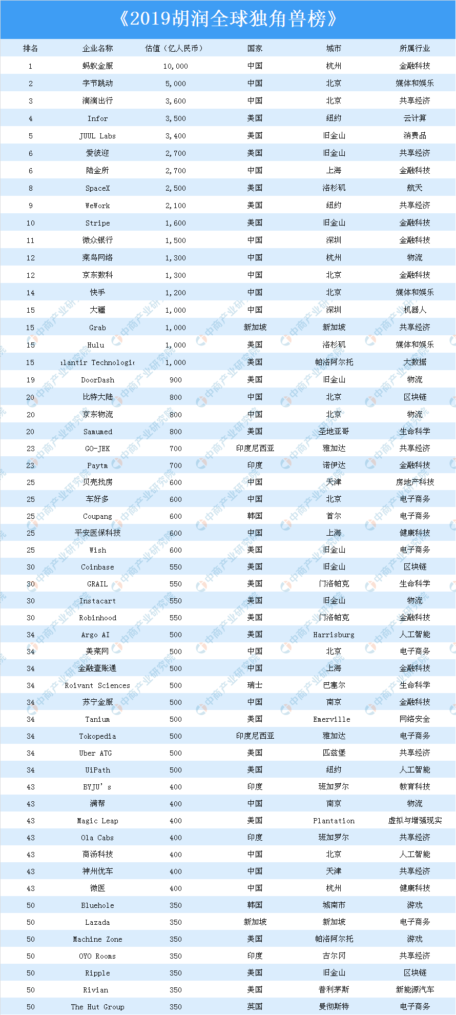 據(jù)悉,這是胡潤(rùn)研究院首次發(fā)布全球獨(dú)角獸榜。此次榜單對(duì)全球估值10億美元以上的科技初創(chuàng)企業(yè)排名,上榜企業(yè)要求創(chuàng)辦不超過10年,獲得過私募投資且未上市。本次榜單估值計(jì)算截止日期為2019年6月30日。