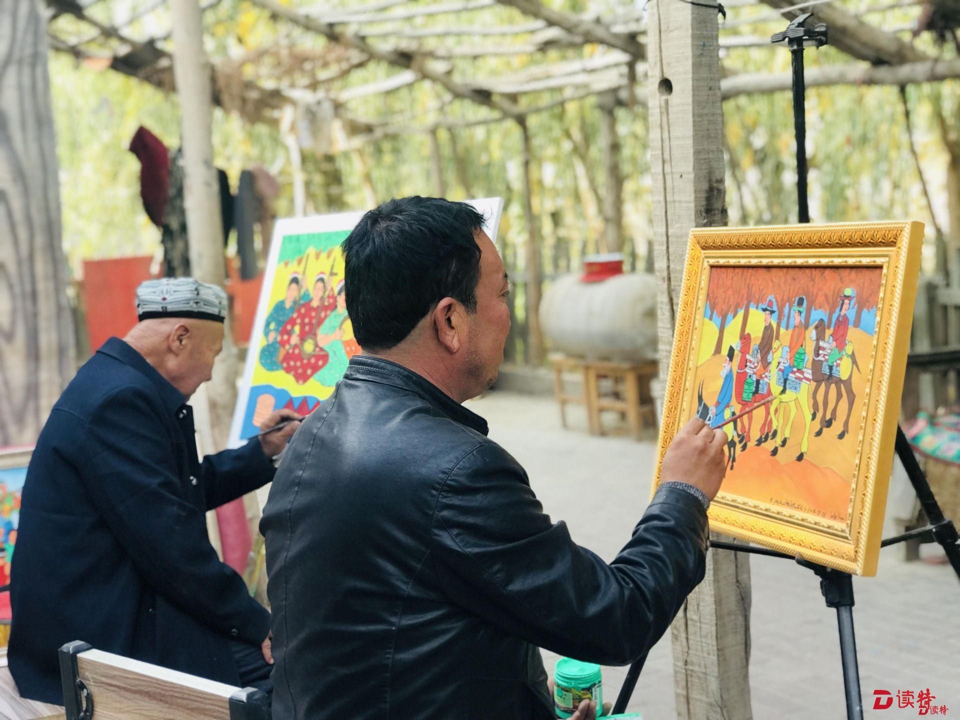 國家級農(nóng)民畫畫家木卡熱埔江·艾海提告訴記者記者,他現(xiàn)在一年有將近45000元的收入,一部分來自于在安居房上畫農(nóng)民畫,一年有30000塊錢的收入,另一部分是自己賣出的畫,一年能掙15000?!艾F(xiàn)在麥蓋提旅游的人多了,看到他們喜歡我的畫,我感到很高興,現(xiàn)在越畫越有勁了!”聊起麥蓋提的發(fā)展,木卡熱埔江的臉上難掩喜悅。