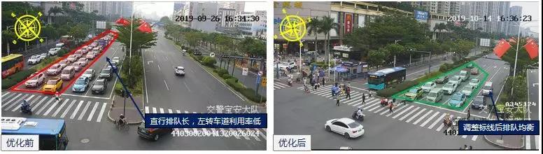 10月2日,針對車道劃分與交通需求不匹配的問題,調(diào)整北進(jìn)口車道劃分,由2左轉(zhuǎn)2直行調(diào)整為1左轉(zhuǎn)3直行,并調(diào)整路口紅綠燈方案,適當(dāng)增加北方向單放綠燈時間,降低南、北對直綠燈時間。優(yōu)化后,北方向通行效率提升明顯,晚高峰期間小時通過量由820pcu/h提高至980pcu/h,提升19.5%。