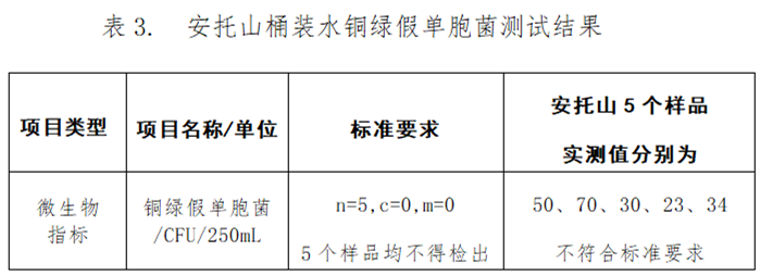 值得注意的是,安托山包裝飲用水檢出銅綠假單胞菌不符合國家標(biāo)準(zhǔn)要求,其他11款桶裝水的微生物指標(biāo)均符合國家要求。經(jīng)反饋,生產(chǎn)廠家深圳市廣進(jìn)源飲品有限公司回函聲稱不是他們公司生產(chǎn)的產(chǎn)品,但截至發(fā)稿廠家并未提供任何證明材料。
