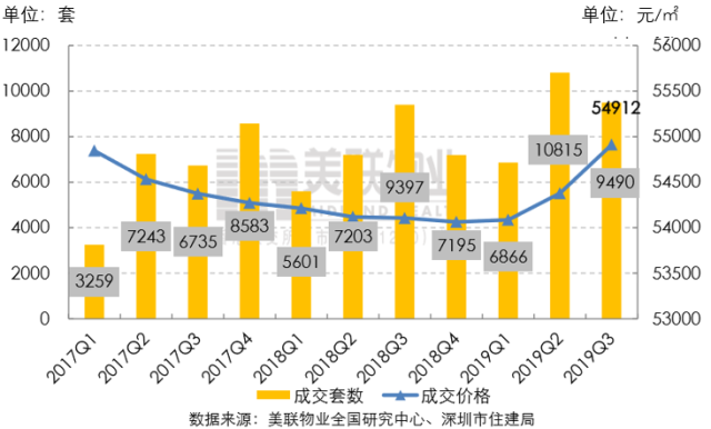 深圳市2017年以來(lái)一手住宅季度成交量?jī)r(jià)走勢(shì)圖