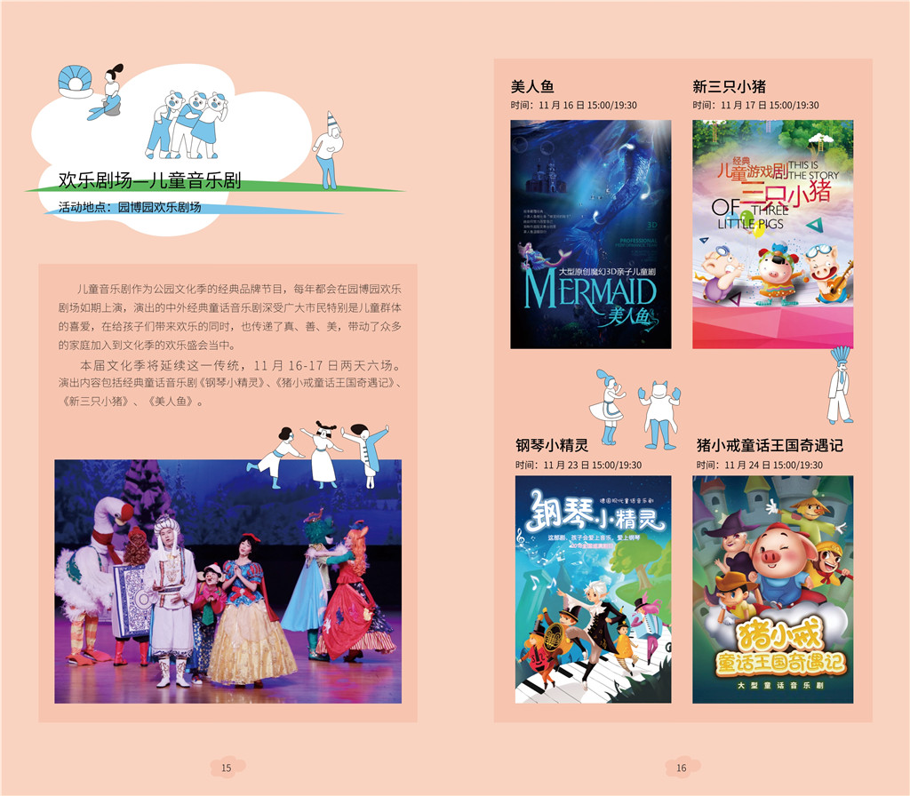 兒童音樂(lè)劇是公園文化季的經(jīng)典品牌節(jié)目。11月16日、17日每天3場(chǎng)兒童音樂(lè)劇在園博園歡樂(lè)劇場(chǎng)舉行,表演中外經(jīng)典童話音樂(lè)劇。