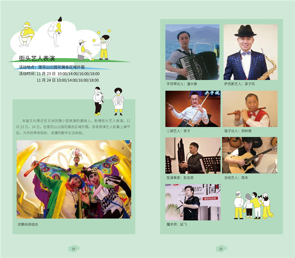 引人關(guān)注的是,本屆公園文化季首次引進(jìn)街頭藝人表演,11月23日、24日,在蓮花山公園花展現(xiàn)場(chǎng),吉他、薩克斯、笛子、笙、揚(yáng)琴、中阮、二胡、雜技、魔術(shù)等各類表演藝人輪番上演節(jié)目,為市民帶來(lái)輕松、浪漫的都市生活體驗(yàn)。