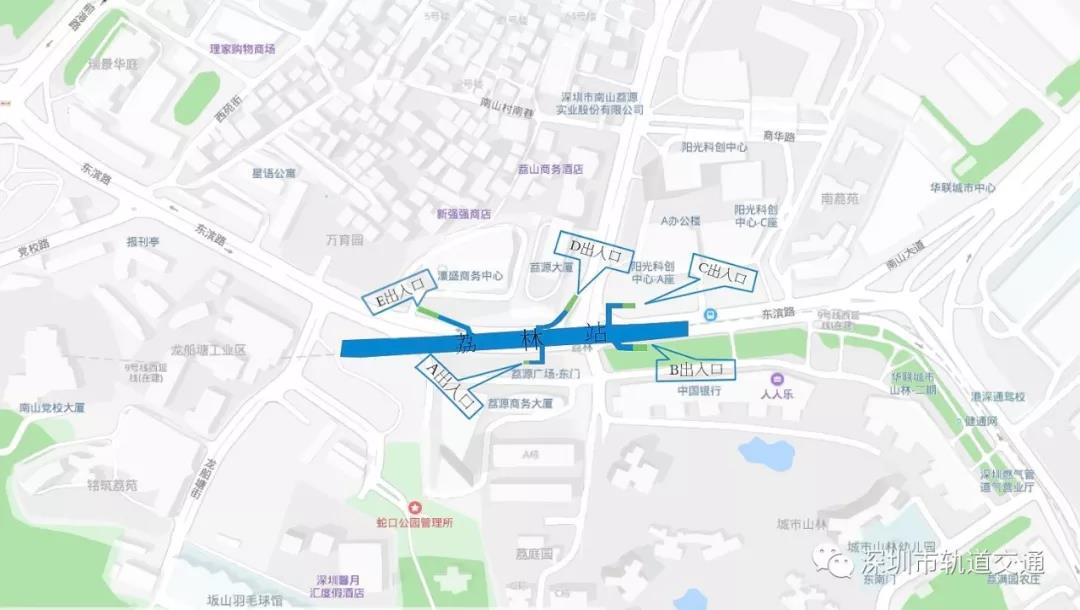 其中,A出入口位于荔園商務(wù)大廈北側(cè),B出入口位于城市山林廣場(chǎng)北側(cè),C出入口位于陽(yáng)光科創(chuàng)南側(cè),D出入口位于荔源大廈東側(cè),E出入口位于濠盛商務(wù)中心南側(cè)。