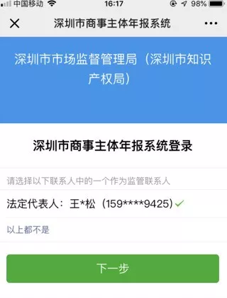 第三步:系統(tǒng)自動彈出市場監(jiān)管聯(lián)系人備選項,選擇市場監(jiān)管聯(lián)系人后,點擊下一步。