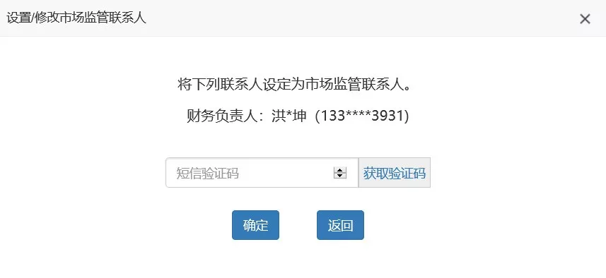 第四步:輸入收到的驗證碼,點擊“確定”,完成市場監(jiān)管聯(lián)系人設(shè)置。