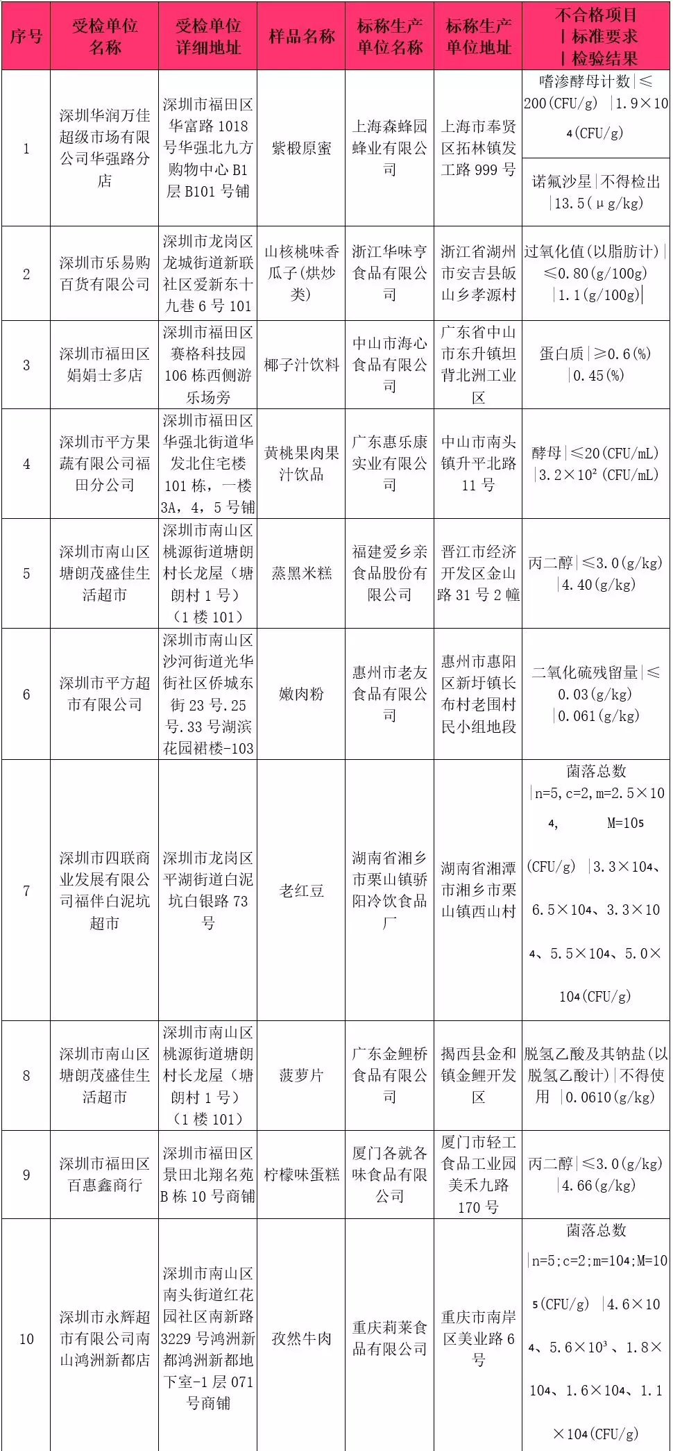 本次共抽檢流通環(huán)節(jié)食品918批次,涉及流通環(huán)節(jié)經營主體230家次,共檢測食品指標5434項次。其中檢出不合格樣品10批次,涉及不合格食品類別有炒貨食品及堅果制品1批次,淀粉及淀粉制品1批次,蜂產品1批次,糕點2批次,冷凍飲品1批次,肉制品1批次,水果制品1批次,飲料2批次;涉及不合格項目類別為獸藥殘留、品質指標、微生物污染、食品添加劑。