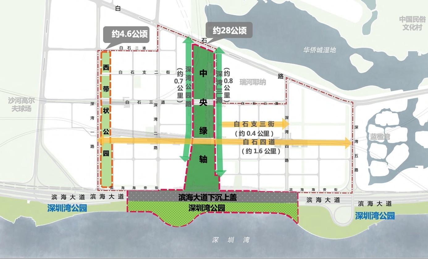 國際咨詢的重點設(shè)計范圍為中央綠軸(約28公頃,含濱海大道下沉上蓋和深圳灣公園部分區(qū)域)(含深灣公園路、深灣三路街道空間)、片區(qū)重要街道(白石四道、白石支三街)、西帶狀公園(約4.6公頃)等。