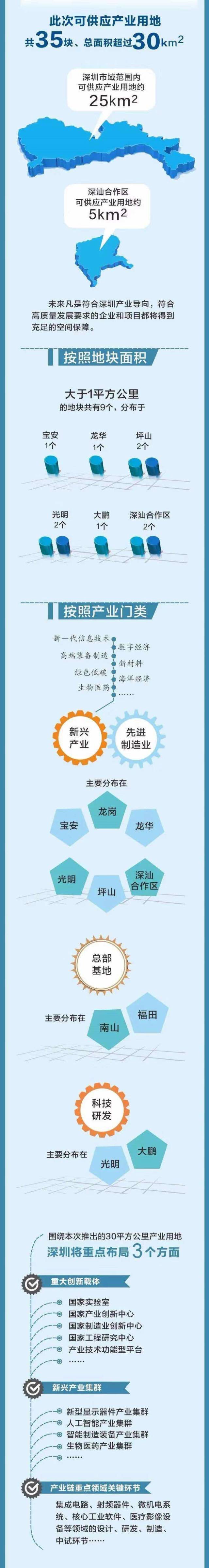 本次推出的30平方公里產(chǎn)業(yè)用地,將重點布局重大創(chuàng)新載體、新興產(chǎn)業(yè)集群和產(chǎn)業(yè)鏈重點領域關鍵環(huán)節(jié)等三大方向,對于深圳率先建設體現(xiàn)高質(zhì)量發(fā)展要求的現(xiàn)代化經(jīng)濟體系發(fā)揮關鍵性支撐作用。
