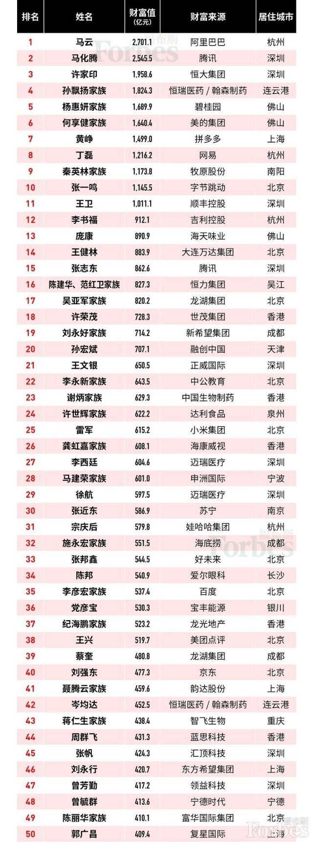 原標(biāo)題:福布斯發(fā)布2019中國(guó)富豪榜:馬云蟬聯(lián)榜首,王健林跌至第14