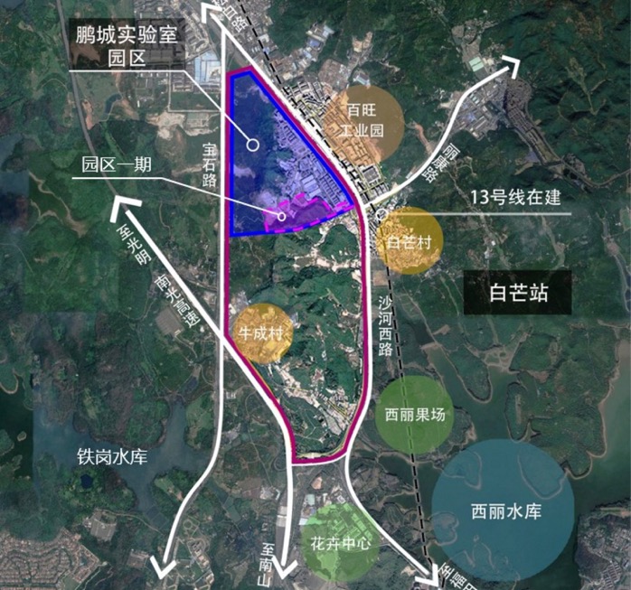 鵬城實驗室目前以留仙洞戰(zhàn)略性新興產業(yè)基地萬科云城一期8棟為實驗室過渡場地。規(guī)劃園區(qū)位于石壁龍園區(qū),坐落于南山西麗湖國際科教城重點規(guī)劃片區(qū)—石壁龍片區(qū)。距離深圳寶安機場12公里,距離規(guī)劃中的西麗高鐵站6公里,對外交通十分便利。同時,基地被鐵崗水庫、羊臺山森林公園、西麗水庫環(huán)繞,自然環(huán)境優(yōu)勢明顯。并且項目靠近深圳大學城,科研創(chuàng)新氛圍濃厚。