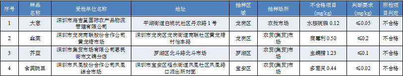 見圳客戶端·深圳新聞網(wǎng)2019年11月12日訊 11月11日,深圳市市場監(jiān)督管理局發(fā)布9月16日-9月20日深圳市農(nóng)產(chǎn)品質量安全豬肉和蔬菜例行監(jiān)測結果。2019年9月16日-9月20日,深圳市市場監(jiān)督管理局在全市監(jiān)測豬肉產(chǎn)品53份,抽檢結果顯示全部樣品合格。抽檢蔬菜共124份,4份抽樣樣品不合格,都為農(nóng)藥檢測超標。其中,深圳市海吉星國際農(nóng)產(chǎn)品物流管理有限公司銷售的大蔥水胺硫磷超標,深圳市龍崗南聯(lián)股份合作公司黃龍?zhí)潦袌鲣N售的韭菜腐霉利超標,深圳市集貿(mào)市場有限公司惠民街市文錦分店銷售的芥藍蟲螨腈超標,深圳市鳳凰股份合作公司鳳凰綜合市場銷售的食莢豌豆多菌靈超標。