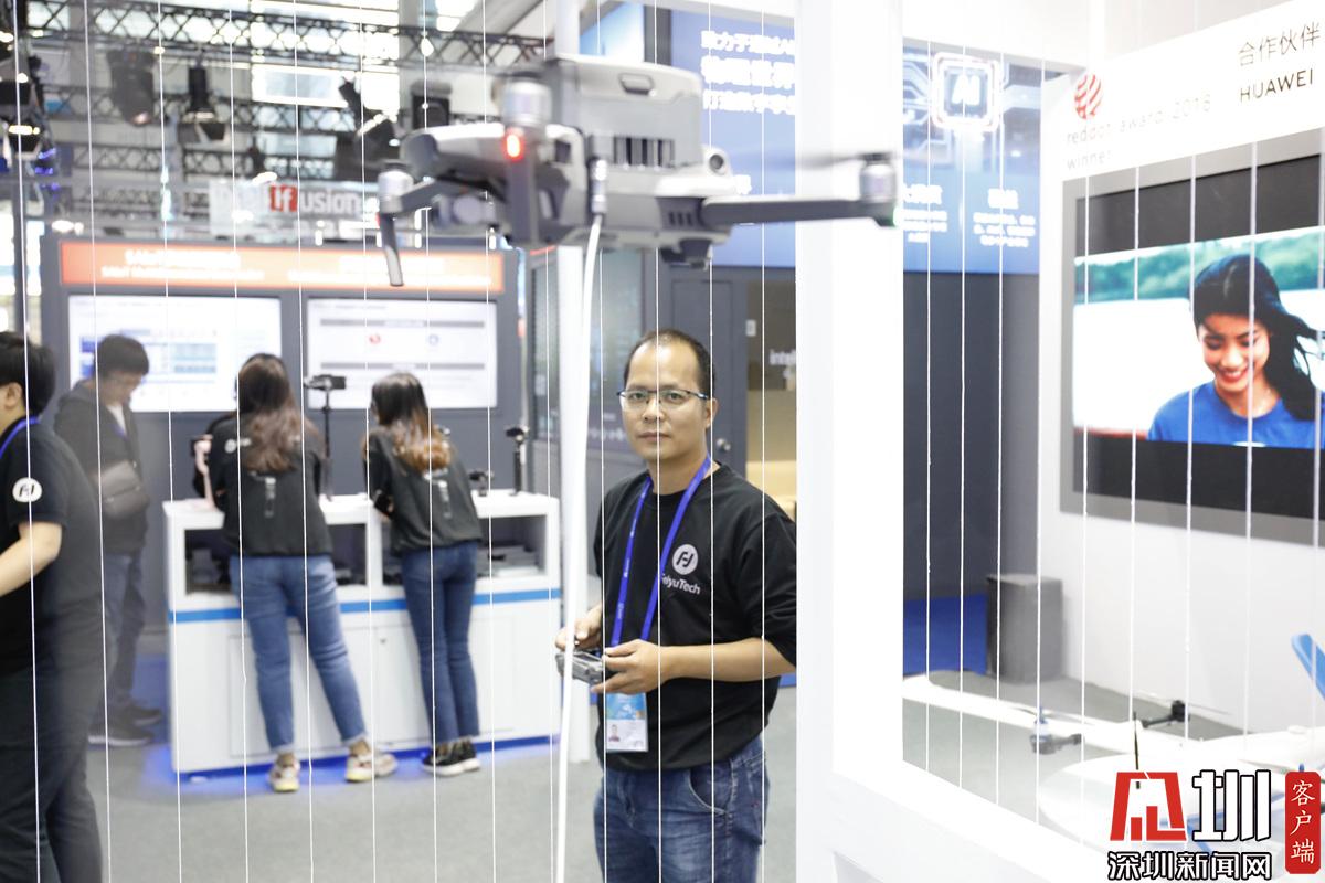 一位展區(qū)工作人員正在操控?zé)o人機。