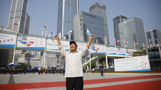 2019年11月13日,深圳會展中心,一位正在與機器互動的觀眾。該機器是由臺灣公司啟云科技設計,多用在營銷領域,用戶可與之互動拍出照片。