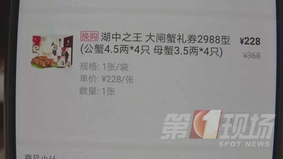 今年9月份,張先生在盒馬鮮生APP上,花228元購買了一張大閘蟹禮券,禮券上清楚寫明,可以兌換4只225克的公蟹,和4只175克的母蟹。