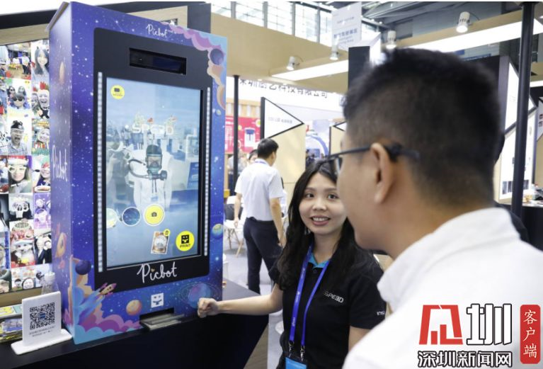 2019年11月13日,深圳會(huì)展中心,一位正在與機(jī)器互動(dòng)的觀眾。該機(jī)器是由臺(tái)灣公司啟云科技設(shè)計(jì),多用在營銷領(lǐng)域,用戶可與之互動(dòng)拍出照片。