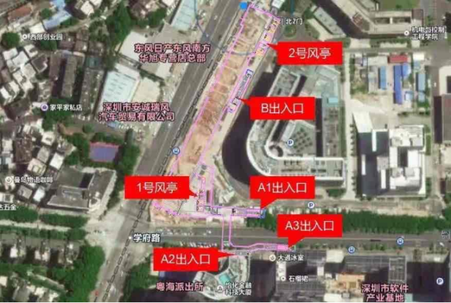 深大南站位于學府路與白石路交界處北側,車站出入口共計4個:A1出入口、A2出入口、A3出入口、B出入口,其中A1出入口位于深圳大學基礎實驗樓一期南側,B出入口位于深圳大學基礎實驗樓一期西側