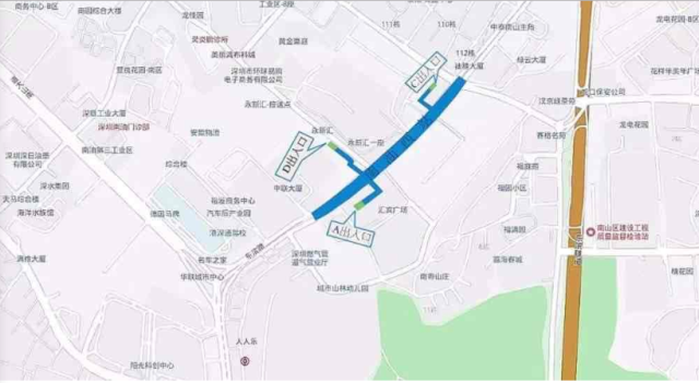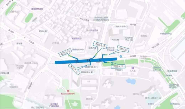 高新南站位于白石路上沿白石路東西向布置,車站出入口共計4個,其中A、B出入口接科技生態(tài)園,C出口靠豪威科技大廈,D出口通向科技南路方向。