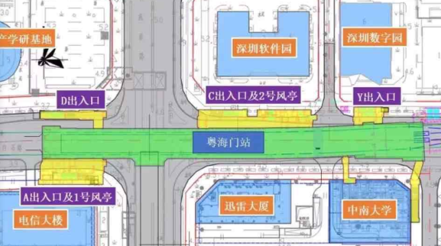 南油站位于南山區(qū)南海大道與登良路交叉口下方,車站出入口共計5個,B出入口位于恒大天璟北側,C出入口位于來福士廣場一側登良路與南海大道交匯處,D1出入口位于金暉大廈東側,A、D2出入口位于南海大道與華明路交匯處
