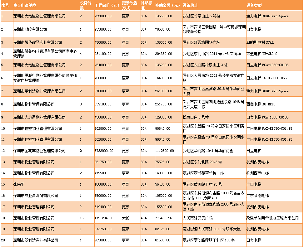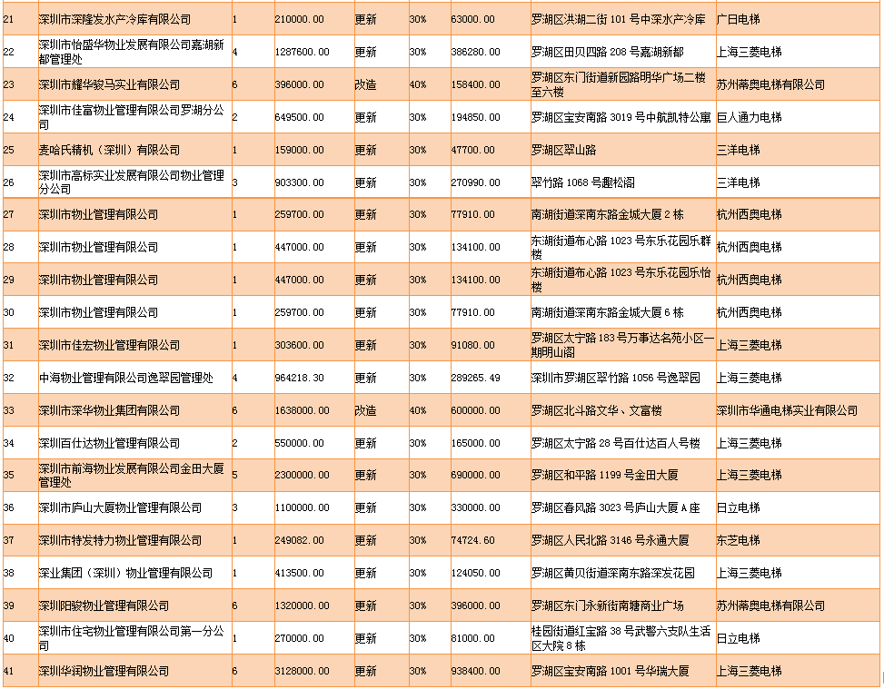 見圳客戶端·深圳新聞網(wǎng)2019年11月15日訊 11月13日,深圳市市場監(jiān)督管理局羅湖監(jiān)管局發(fā)布關(guān)于2019年羅湖區(qū)老舊電梯更新改造大修補助名單的公示,公示稱,為推進羅湖區(qū)老舊電梯更新改造大修工作,保障市民群眾生命安全,羅湖區(qū)施行老舊電梯更新改造大修補助政策。2019年,經(jīng)專家現(xiàn)場驗收,羅湖區(qū)共有41家申請單位的112臺老舊電梯更新改造大修工程通過驗收(其中更新84臺、改造12臺,大修16臺),涉及工程總價3084.57萬元,發(fā)放補助資金9640009.05元。