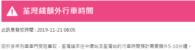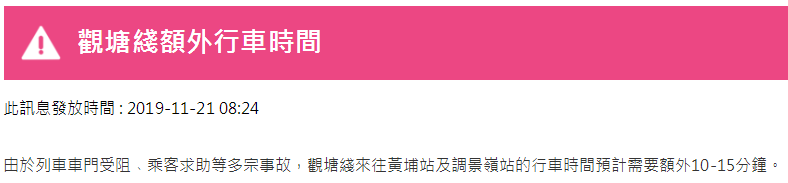 此外,目前,由于列車車門受阻,乘客求助等多宗事故,港島線來往堅(jiān)尼地城站及柴灣站、荃灣線來往中環(huán)站及荃灣站、觀塘線來往黃埔站及調(diào)景嶺站,行車時(shí)間預(yù)計(jì)需要額外10至15分鐘。