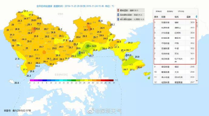 11月24日,深圳大部分地區(qū)最高氣溫在28-29 ℃,有8個站點破了"3"字頭(這熟悉的黃色圖……)